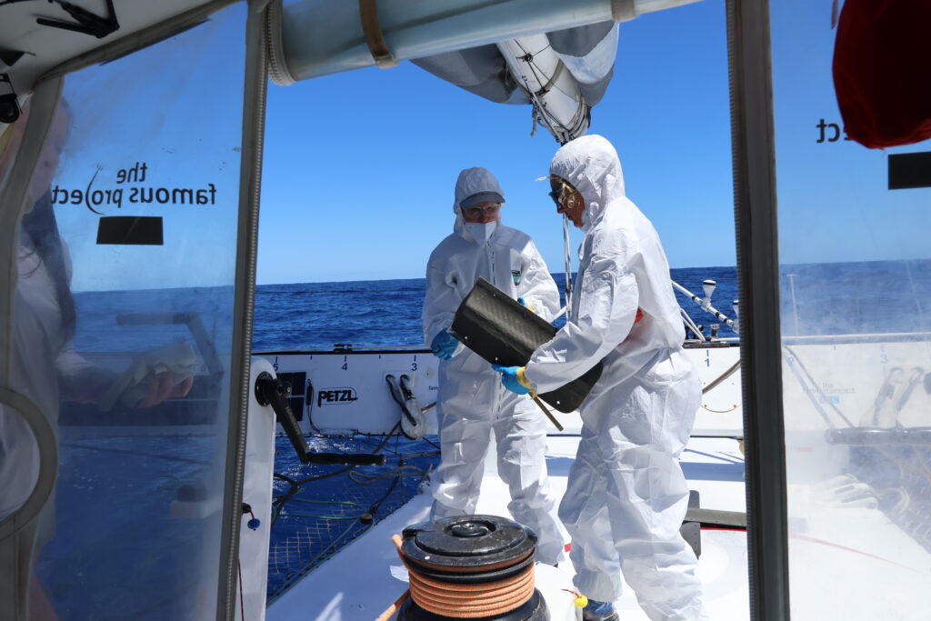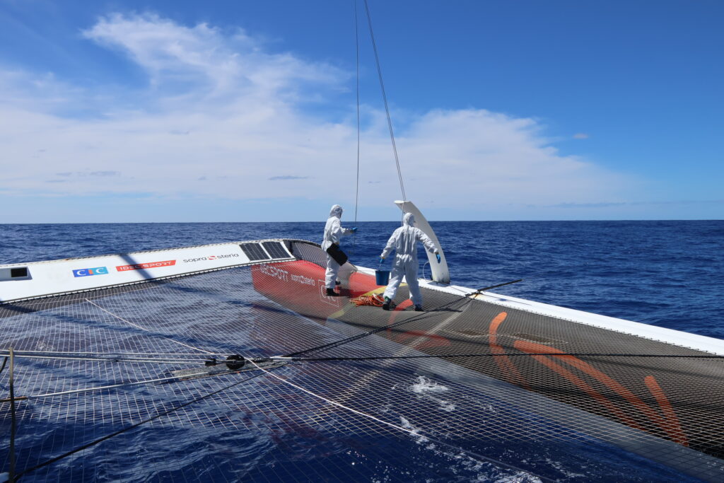 Les conditions on ne peut plus calmes d’hier ont aussi permis à l’équipage de constater la dégradation de leur foil tribord, celui-là même qui avait, lors du passage sous Leeuwin, percuté à grande vitesse un gros filet de pêche et ses flotteurs. En essayant de le remonter à l’approche du petit temps, l’équipage n’a pu que constater sa délamination. Il est désormais remonté en position haute, inutilisable.
